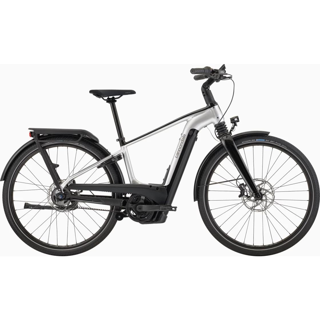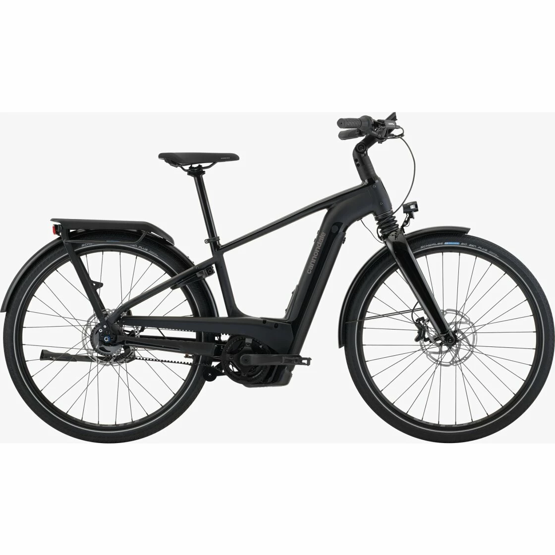 Integrated headtube running light, Axa Blueline 30 front light, Axa Blueline rear light, Abus framelock (key-matched with battery lock), Cannondale Urban rear rack (25kg, Racktime compatible), full-coverage fenders