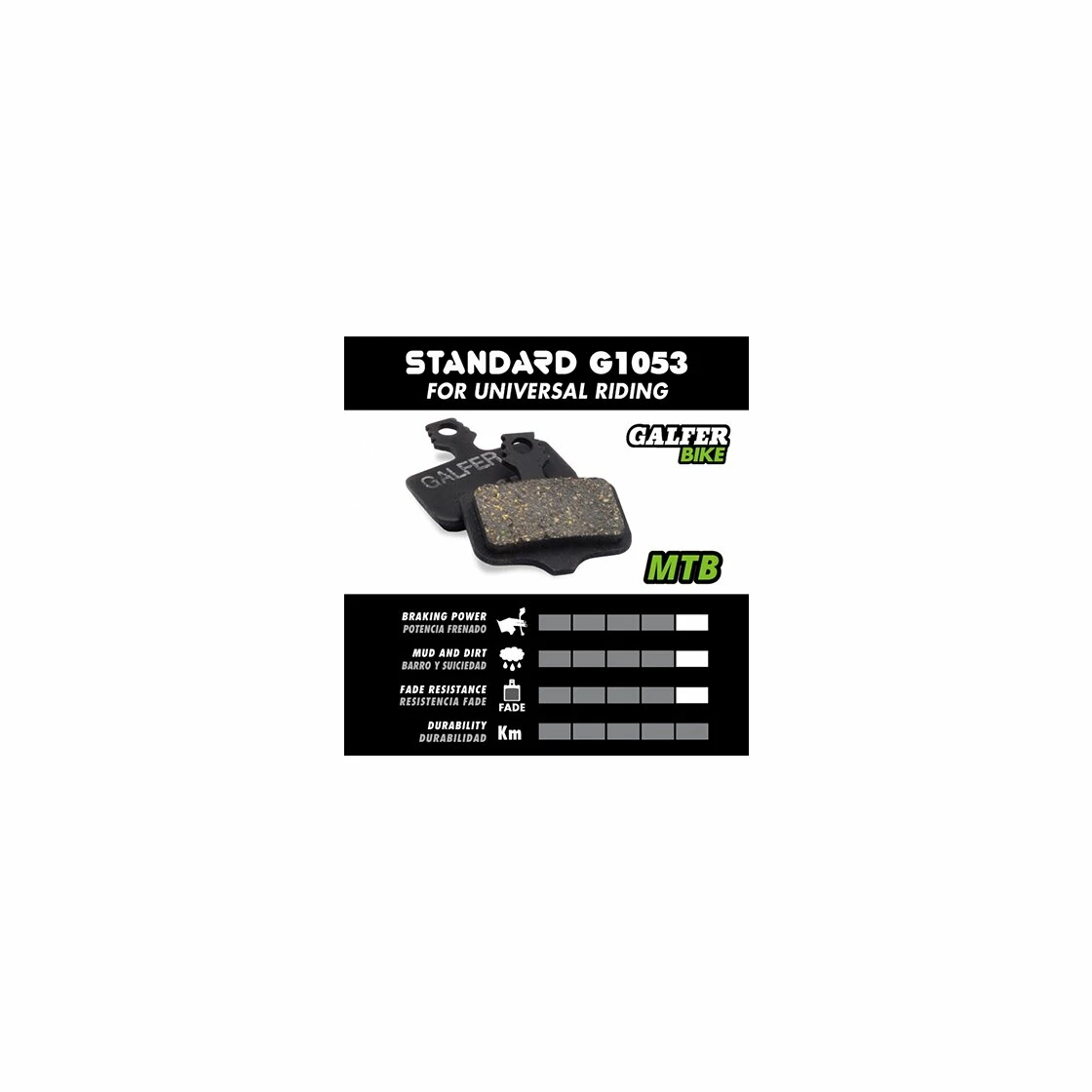 Die schwarzen Standard-Beläge sind für den Einsatz in XC und Enduro konzipiert. Sie zeichnen sich durch hervorragende Haltbarkeit aus und punkten auch in den Disziplinen Fading-Resistenz, Bremskraft und dem Einsatz in Dreck und Schlamm.